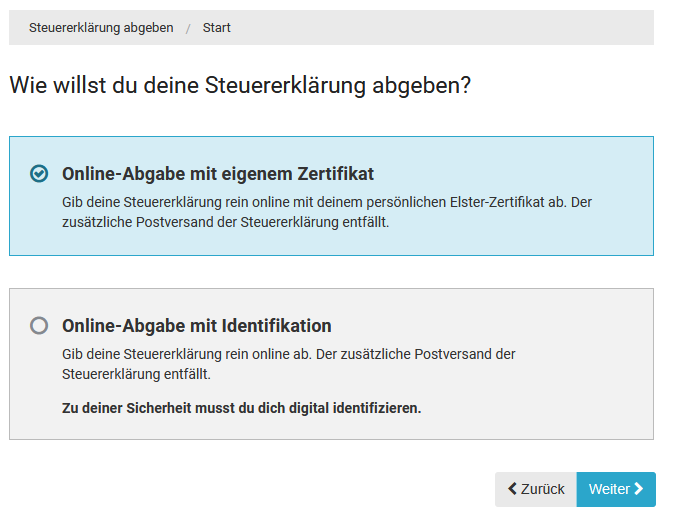 1. Online-Abgabe mit Elster-Zertifikat