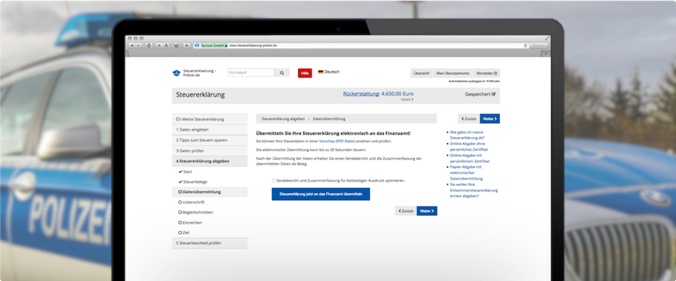 Alle Angaben werden automatisch auf Richtigkeit und Plausibilität geprüft. Danach übermittelst du mit Steuererklaerung-Polizei.de deine Steuererklärung sicher an das Finanzamt und prüfst anschließend den Steuerbescheid.
