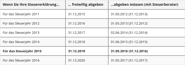 Ihre Steuererklärung für 2015 müsste also bis zum 31. Dezember 2019 eingehen – keinen Tag später, sonst ist die ganze Arbeit für die Katz. Ende 2016 läuft die Frist für die Steuererklärung des Jahres 2012 aus. Besser ist es jedoch, man reizt den Spielraum nicht aus, sondern kümmert sich frühzeitig. Erfahrungsgemäß ist es leichter, die nötigen Unterlagen im Folgejahr zusammenzustellen, als drei Jahre später. Außerdem geht es ums Geld – wer will schon vier Jahre lang auf die Rückzahlung warten?