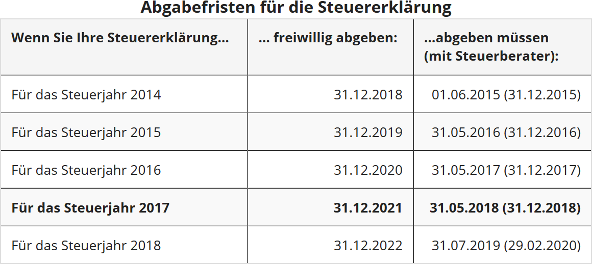 Ihre Steuererklärung für 2018 müsste also bis zum 31. Dezember 2022 eingehen – keinen Tag später, sonst ist die ganze Arbeit für die Katz. Ende 2019 läuft die Frist für die Steuererklärung des Jahres 2015 aus. Besser ist es jedoch, man reizt den Spielraum nicht aus, sondern kümmert sich frühzeitig. Erfahrungsgemäß ist es leichter, die nötigen Unterlagen im Folgejahr zusammenzustellen, als drei Jahre später. Außerdem geht es ums Geld – wer will schon vier Jahre lang auf die Rückzahlung warten?