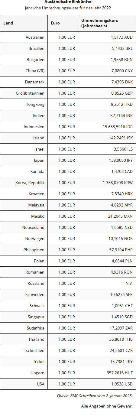 Die Umrechnung von Einkünften in ausländischer Währung muss auf Monatsbasis mit dem Euro-Referenzkurs der Europäischen Zentralbank erfolgen. Die monatlichen Umrechnungskurse werden vom Bundesfinanzministerium ermittelt.