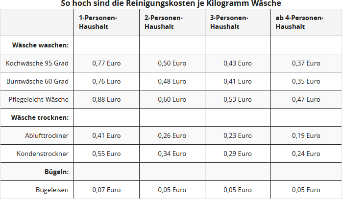 Waschst du deine Berufskleidung selbst, kannst du die Kosten dafür schätzen. Für die Reinigung von Berufsbekleidung erkennt der Fiskus und die Rechtsprechung den Ansatz der Erfahrungswerte der Verbraucherverbände an (Urteil des Finanzgericht Baden-Württemberg, 3 K 202/04). Die Arbeitsgemeinschaft der Verbraucherverbände e.V., Bonn hat dafür die Kosten für einen Waschgang ermitteln lassen, bezogen auf jeweils ein kg Wäsche (Stand Dez 2002):