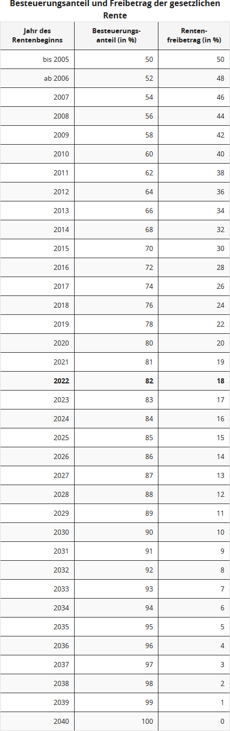 Seit 2005 steigt der sog. Besteuerungsanteil jährlich um zwei Prozentpunkte, ab 2021 um einen Prozentpunkt pro Jahr. Ursprünglich sollten Personen, die ab 2040 in Rente gehen, ihre gesetzlichen Renteneinnahmen voll versteuern. Aber: Aufgrund geänderten Gesetzes steigt der Besteuerungsanteil ab 2023 beginnend mit dem Rentnerjahrgang 2023 statt um 1 Prozentpunkt nur noch um jährlich einen halben Prozentpunkt an und erreicht nach seinem kontinuierlichen jährlichen Aufwuchs erstmals für den Jahrgang 2058 100 Prozent (§ 22 Nr. 1 Buchst. a Doppelbuchst. aa EStG, geändert durch das "Wachstumschancengesetz").