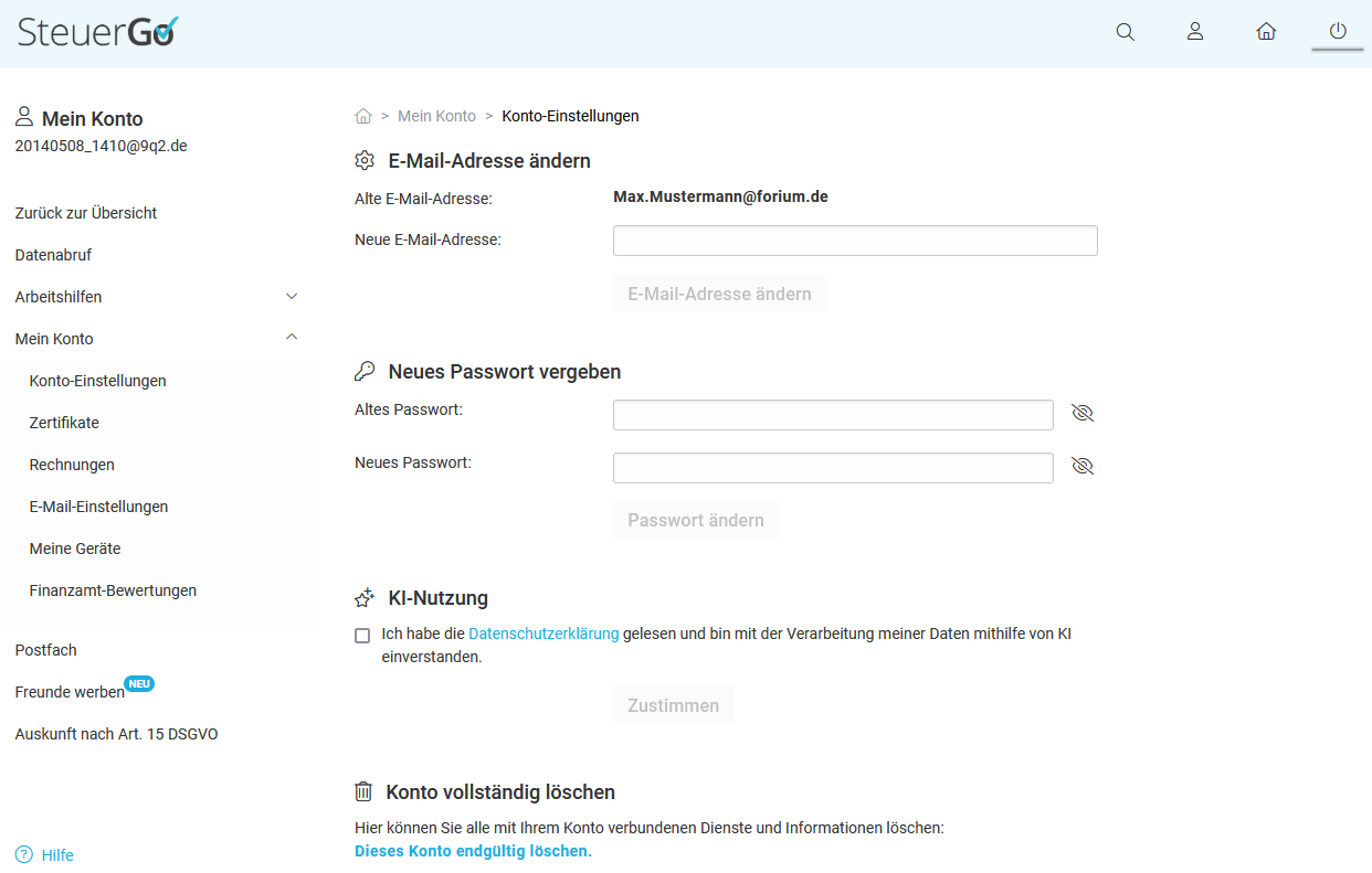 Nach dem Login wähle im Menu "Mein Benutzerkonto > Benutzerkonto" aus. In dem sich öffnenden Fenster hast du unter der Überschrift "Nutzerkonto vollständig löschen" die Möglichkeit, dein Konto zu schließen und alle damit verknüpften Dienste und Informationen zu löschen.