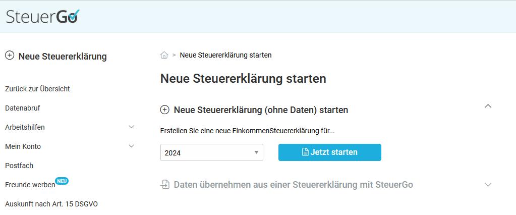 Wenn du die Daten aus 2022 beispielsweise nach 2024 übernehmen willst, musst du zuerst eine Steuererklärung für 2023 mit den Daten aus 2022 erstellen. Anschließend kannst du die Datenübernahme von 2023 nach 2024 vornehmen.