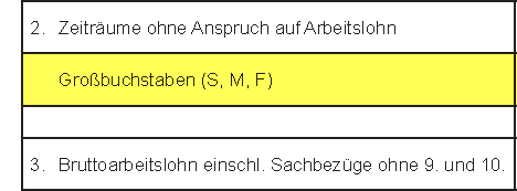 - Der Großbuchstabe S wird eingetragen, wenn die Lohnsteuer von einem sonstigen Bezug des ersten Dienstverhältnisses berechnet wurde, aber ohne die Berücksichtigung von Arbeitslohn aus früheren Dienstverhältnissen in dem Kalenderjahr.