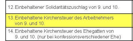 - Kirchensteuer des Arbeitnehmers zu Versorgungsbezügen / Arbeitslohn für mehrere Jahre (Zeile 13)