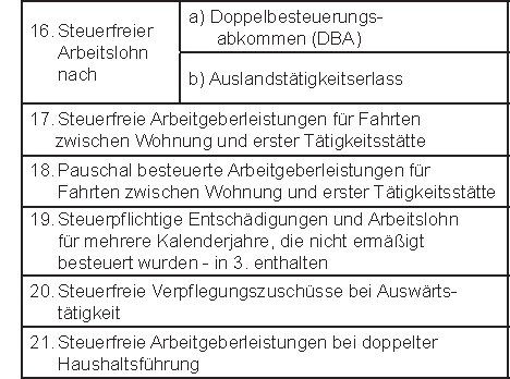 Setzen Sie hier ein Häkchen, wenn auf Ihrer Lohnsteuerbescheinigung in den Zeilen 16 bis 21 Eintragungen zu finden sind. Dies betrifft: