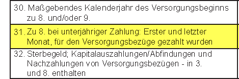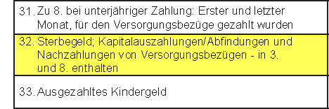 Separat zu erfassen sind einmalige Versorgungsbezüge in Sonderfällen, wie Sterbegeld oder Kapitalabfindungen. Diese geben Sie in Zeile 32 an.
