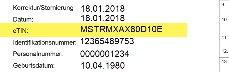 Die Steuer-ID ist nicht zu verwechseln mit der eTIN, die sich ebenfalls in der Lohnsteuerbescheinigung befindet und vom Arbeitgeber für die Datenübermittlung der Lohndaten genutzt wird.