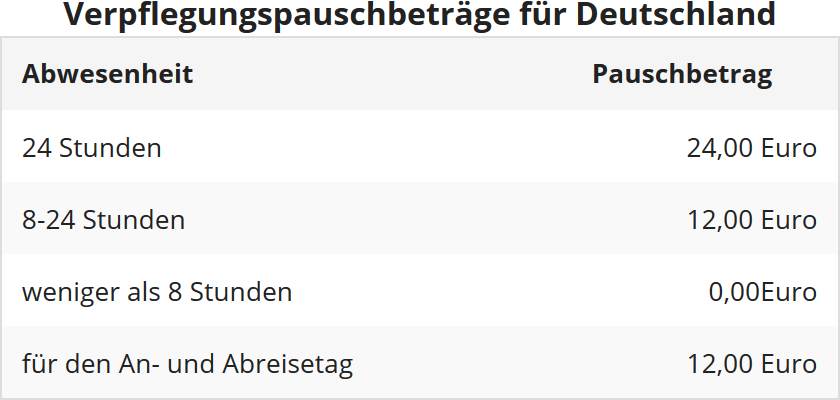 Für Deutschland gilt also ein Tagessatz von 24 Euro, d.h. 4,80 Euro für ein Frühstück (20 % von 24 Euro) und 9,60 Euro für ein Mittag- bzw. Abendessen (40 % von 24 Euro).