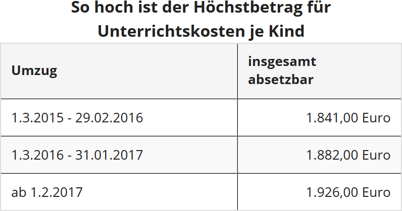 - Wird wegen des Schulwechsels Ihrer Kinder Nachhilfeunterricht erforderlich, können Sie im Jahre 2016 die Kosten absetzen, und zwar bis zu folgendem Höchstbetrag: