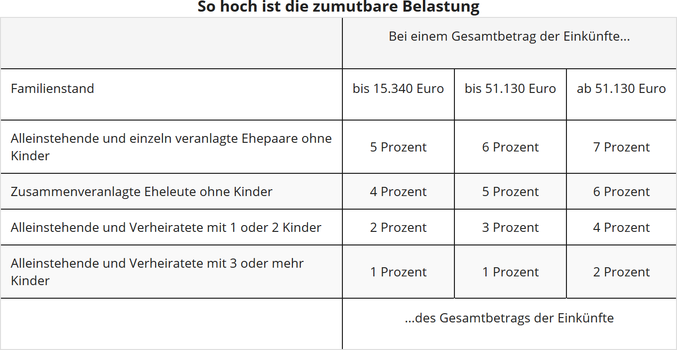 Wenn Sie im Jahr ein Einkommen von 30.000 Euro haben, liegt Ihre zumutbare Belastung als Ehepaar mit einem Kind bei drei Prozent des Einkommens. Das wären 900 Euro. Liegen Sie mit Ihren Ausgaben über diesem Betrag, lohnt es sich, dies anzugeben.