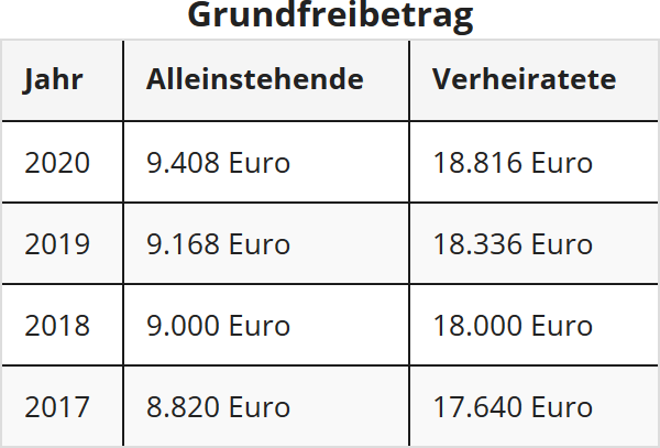 Der steuerliche Grundfreibetrag stellt sicher, dass der Anteil des Einkommens, der für den Lebensunterhalt absolut notwendig ist, nicht mit Steuern belastet wird (Existenzminimum). Ab dem 1.1.2019 wird der Grundfreibetrag von 9.000 Euro auf 9.168 Euro angehoben. Für Verheiratete gilt der doppelte Betrag (§ 32a EStG). Zum 1.1.2020 erfolgt eine weitere Anhebung auf 9.408 Euro bzw. 18.816 Euro (§ 32a EStG, geändert durch das "Familienentlastungsgesetz").