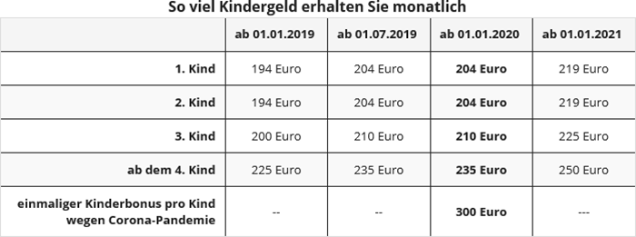 Aktuell: Familien haben in besonderem Maße unter der Corona-Krise zu leiden. Für jedes kindergeldberechtigte Kind wurde das Kindergeld daher im Jahre 2020 einmalig um 300 Euro - sog. Kinderbonus 2020 - erhöht (§ 6 Abs. 3 BKKG; § 66 Abs. 1 Satz 3 EStG).