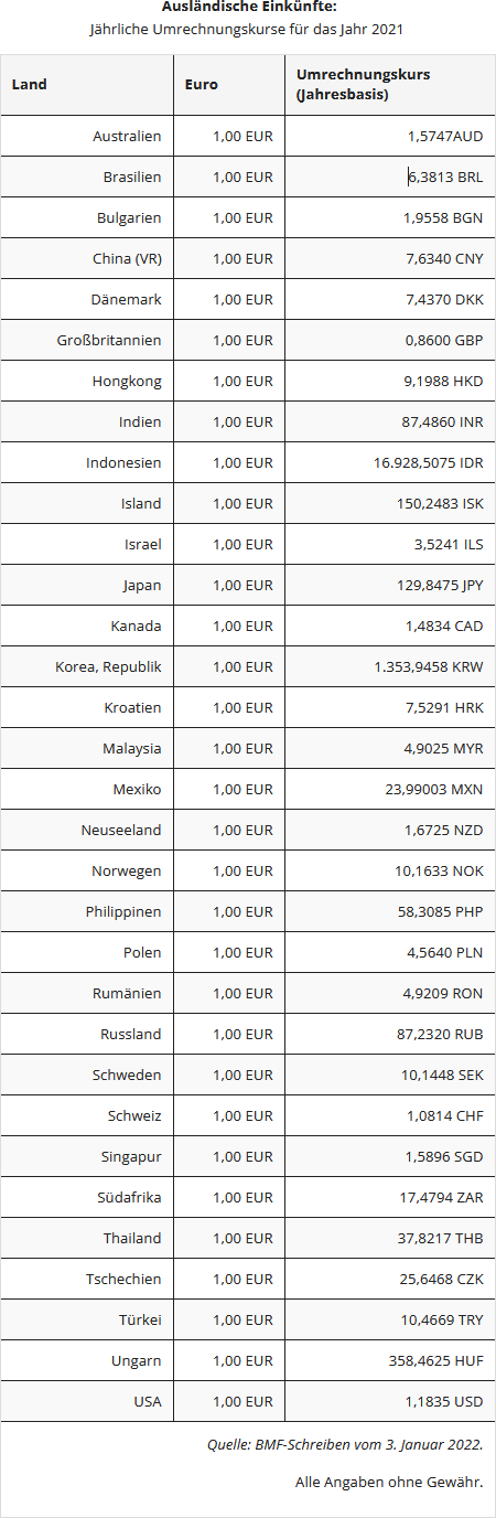 - Die Umrechnung der Einkünfte muss mit dem Euro-Referenzkurs der Europäischen Zentralbank erfolgen. Und zwar mit den monatlichen Durchschnittskursen. Diese Euro-Referenzkurse entsprechen den Umsatzsteuer-Umrechnungskursen, die vom Bundesfinanzministerium monatlich festgesetzt und im Bundessteuerblatt I veröffentlicht werden.