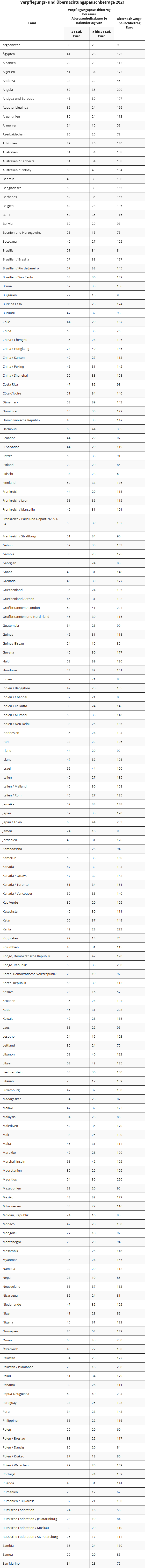 Für beruflich oder betrieblich veranlasste Auslandsreisen und für doppelte Haushaltsführung im Ausland gelten im Jahre 2021 folgende Verpflegungs- und Übernachtungspauschbeträge (BMF-Schreiben vom 03.12.2020, IV C 5-S 2353/19/10010-002).