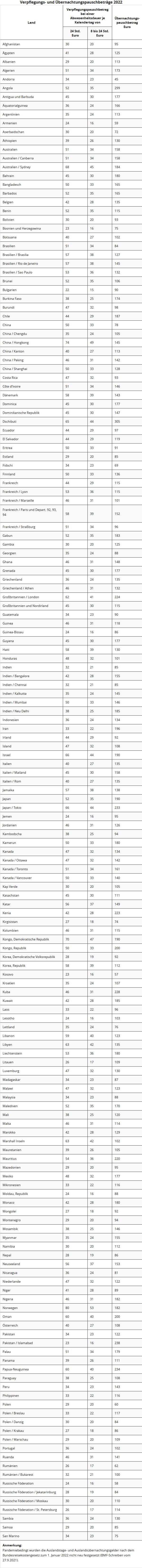 Für beruflich oder betrieblich veranlasste Auslandsreisen und für doppelte Haushaltsführung im Ausland gelten 2022 folgende Verpflegungs- und Übernachtungspauschbeträge (BMF-Schreiben vom 03.12.2020, IV C 5-S 2353/19/10010-002).