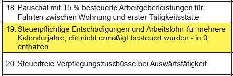 - Der steuerpflichtige Teil der außerordentlichen Einkünfte (Abfindung, Jubiläumszuwendung, Vergütung für mehrjährige Tätigkeit usw.) wird aus dem zu versteuernden Einkommen herausgerechnet.