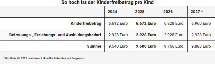 Der jährliche Kinderfreibetrag liegt im Jahre 2025 für Eltern, die steuerlich zusammen veranlagt werden, bei 6.024 Euro, der BEA-Freibetrag (für Betreuung, Erziehung und Ausbildung) bei 2.928 Euro. So steht Eltern für das Steuerjahr 2025 ein Freibetrag von insgesamt 8.952 Euro je Kind zu. Für getrennt Veranlagte bzw. Alleinstehende gilt, dass jeder Elternteil jeweils Anspruch auf den halben Freibetrag hat.
