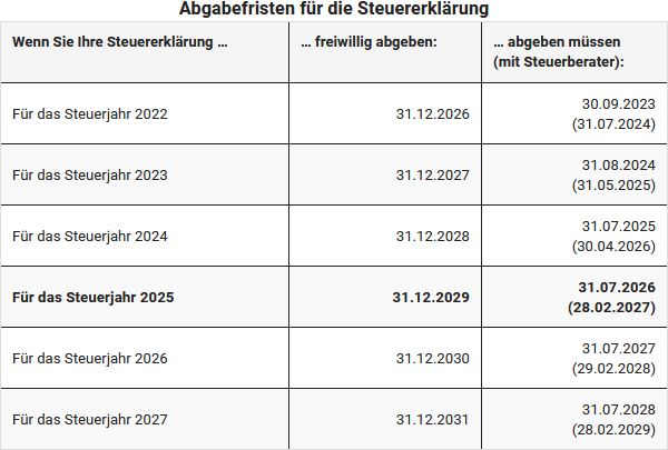 Für eine freiwillige Steuererklärung (ohne Abgabepflicht) gilt eine Frist bis zum 31. Dezember 2029. Eine frühzeitige Abgabe kann jedoch zu einer schnelleren Steuerrückzahlung führen.