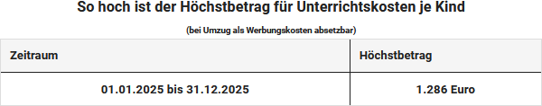 Benötigen die Kinder nach einem beruflich veranlassten Umzug Nachhilfeunterricht, sind die Kosten dafür bis zu einem Höchstbetrag als Werbungskosten absetzbar. Auch dieser Höchstbetrag wird angehoben.
