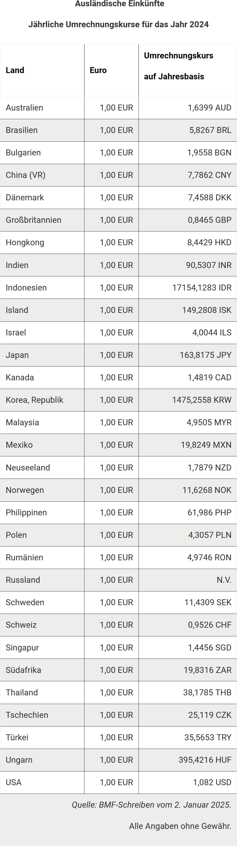 Hier findest du eine Übersicht über die Umrechnungskurse auf Jahresbasis für die wichtigsten ausländischen Währungen.
